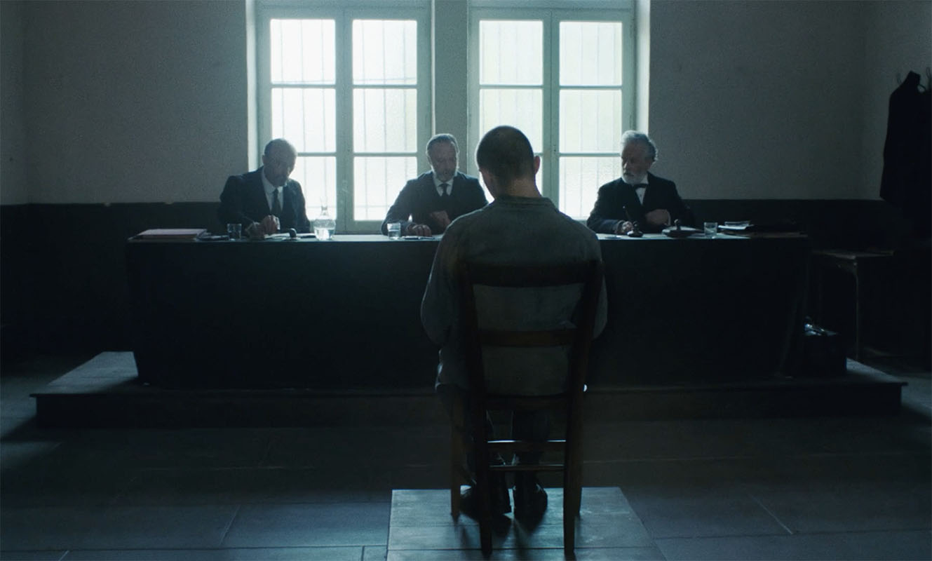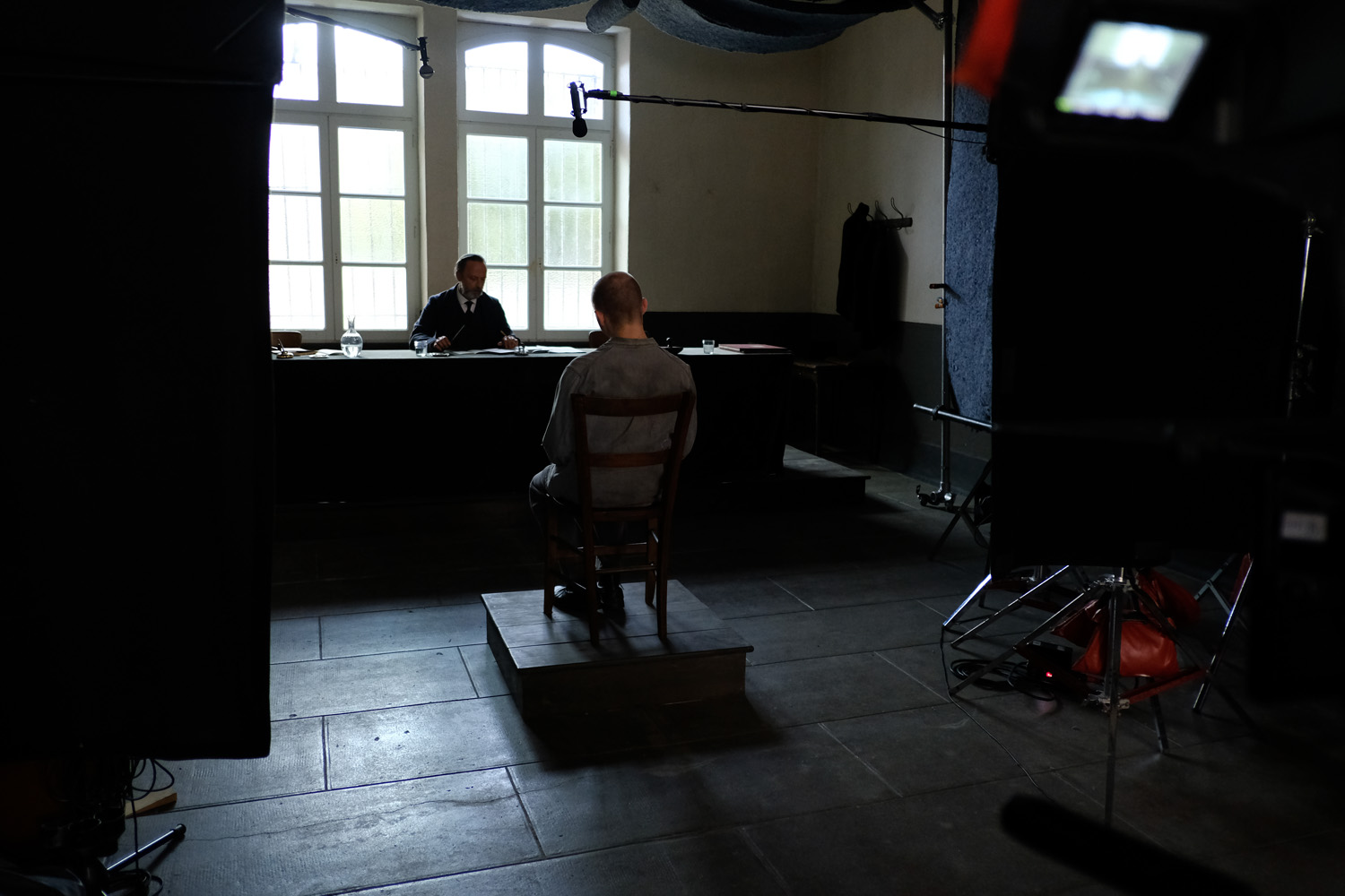Dans les choix de décors, l’institution surplombe toujours Bruno : dans l’interrogatoire, avec cette estrade par exemple, à quel point était-ce conscient ? Ça ne fait pas expressionniste, Bruno n’est pas écrasé, il y a toujours un équilibre fin entre choix de focale, hauteur caméra et décor.