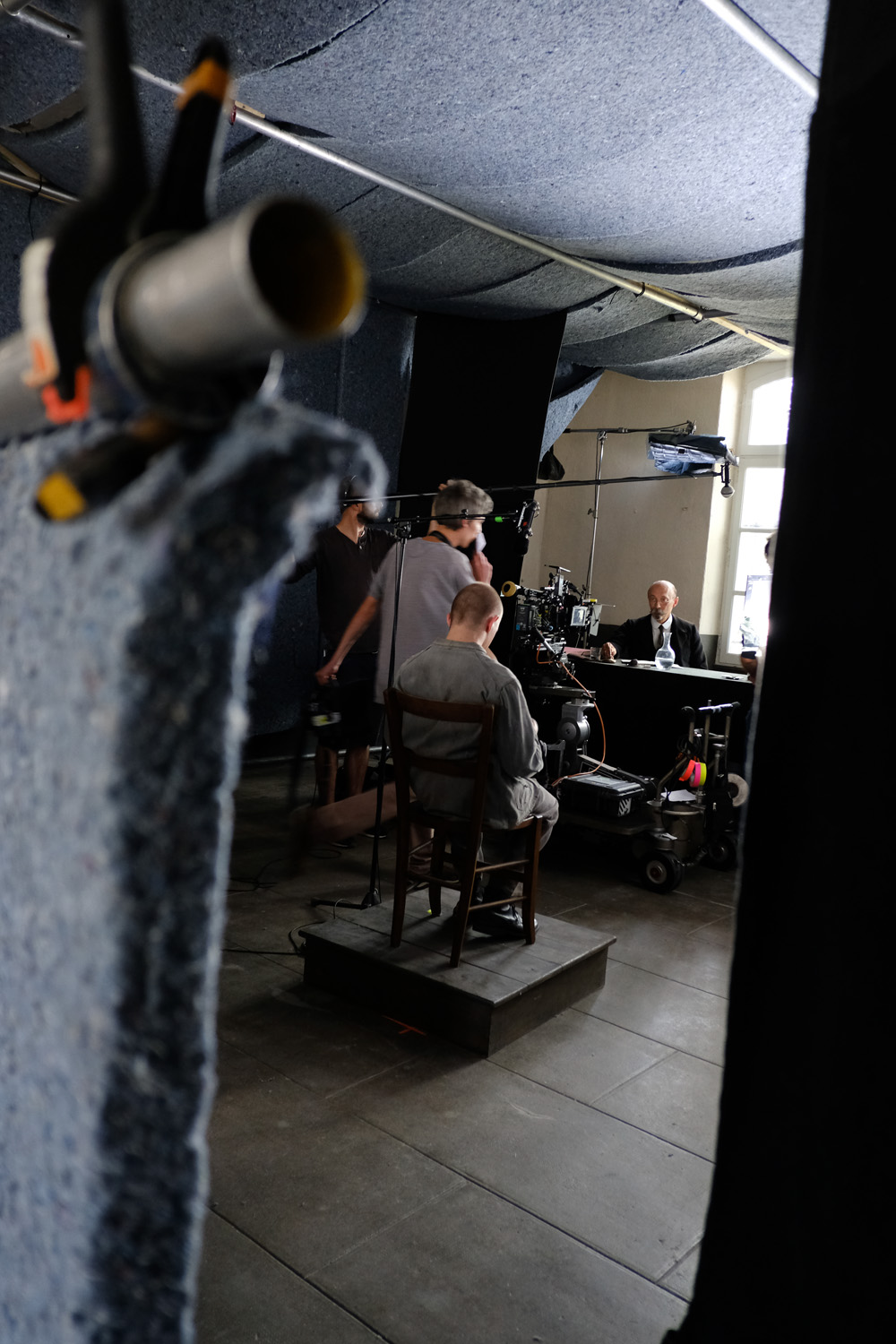 V.L. Dans la salle d’examen, derrière la fenêtre vous aviez fait une grosse installation de toiles. L’idée c’est aussi que l’interrogatoire se passe sur plusieurs mois et qu’on va de plus en plus vers une lumière hivernale. Ça doit se sentir mais pas trop, et pourtant on a tourné toutes ces séquences en cinq jours.