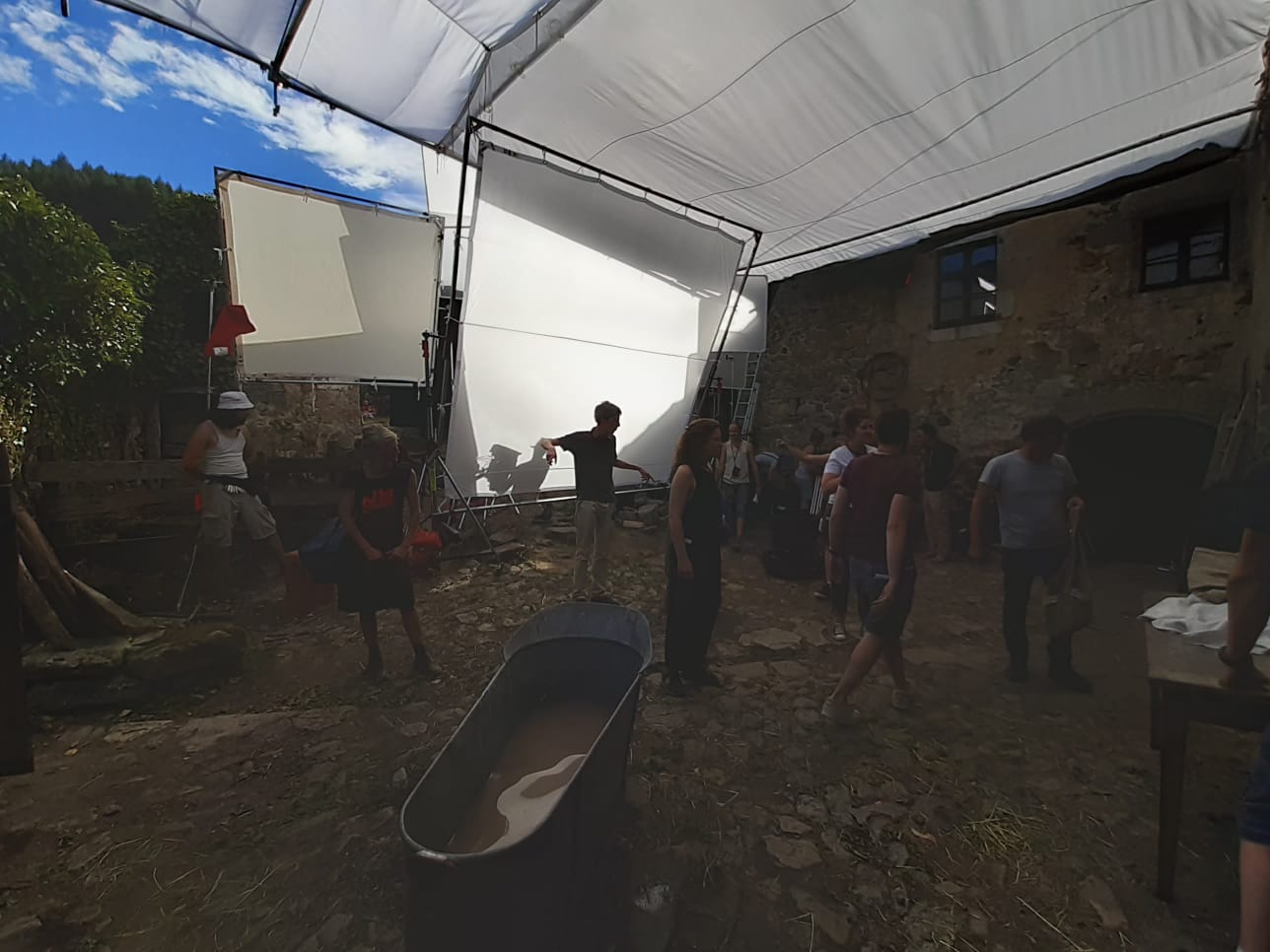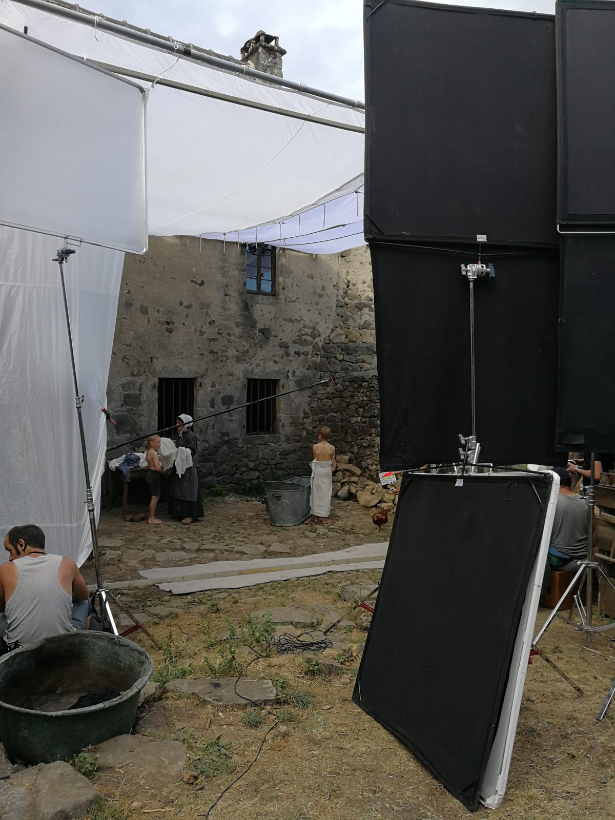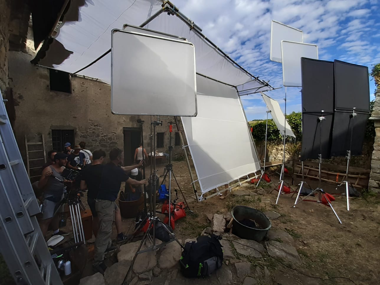Parfois dans la cour de ferme il y avait des réflecteurs de partout, car la ferme n’était pas si bien exposée, il y a des collines autour. Le soleil était vite derrière la colline, vers 16h, malgré le fait qu’on tournait en été.