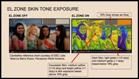 Le Zone System EL s’inspire du célèbre zone system du photographe Ansel Adams et se présente comme une alternative aux systèmes de fausses couleurs existants que nous connaissons sur de nombreuses caméras numériques modernes. Les fausses couleurs font référence à des valeurs IRE (basées sur des pourcentages de tension), alors que l’ELZS affiche une lecture en couleur des écarts de diaphs qui correspondent à celles de nos posemètres et de nos objectifs. La valeur médiane de l’ELZS correspond donc au gris 18% (qui s’affiche comme du gris), et les autres couleurs correspondent à des valeurs de diaph classiques. Il y a au total 15 couleurs dans le système ; 13 représentant un diaph complet, et deux qui représentent 1/2 diaph juste au-dessus et au-dessous du 18% de gris.