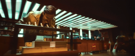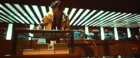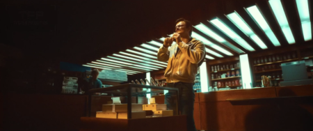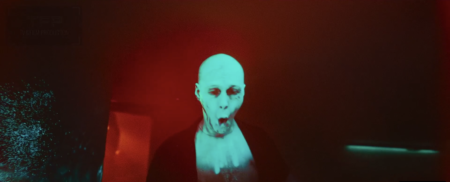 Another shot that seemed rather classic at first suddenly surprised the whole audience in a fairly good way. A man in a nightclub rubs cocaine on his teeth, then walks facing a backwards tracking shot. When the bitter taste starts to act up, he walks through a door, grimaces, and is suddenly lit by ultraviolet light that brings out dripping blue makeup, completely invisible the previous second. A purely cinematographic effect that brings us closer to his feelings. The blue makeup only appears very briefly on the screen, without any other effect, increasing its strength.
