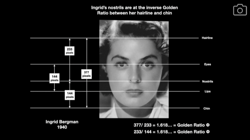 En poursuivant le séminaire, il a montré comment le visage humain lui-même est un « nid » de ratios d’or. Par exemple, la distance entre la racine des cheveux et le nez divisée par la distance entre le nez et le menton est un ratio d’or. Vous avez donc un visage (constitué de ratios d’or) encadré par un autre ratio d’or sur l’écran.