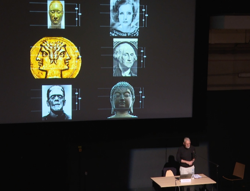 En poursuivant le séminaire, il a montré comment le visage humain lui-même est un « nid » de ratios d’or. Par exemple, la distance entre la racine des cheveux et le nez divisée par la distance entre le nez et le menton est un ratio d’or. Vous avez donc un visage (constitué de ratios d’or) encadré par un autre ratio d’or sur l’écran.