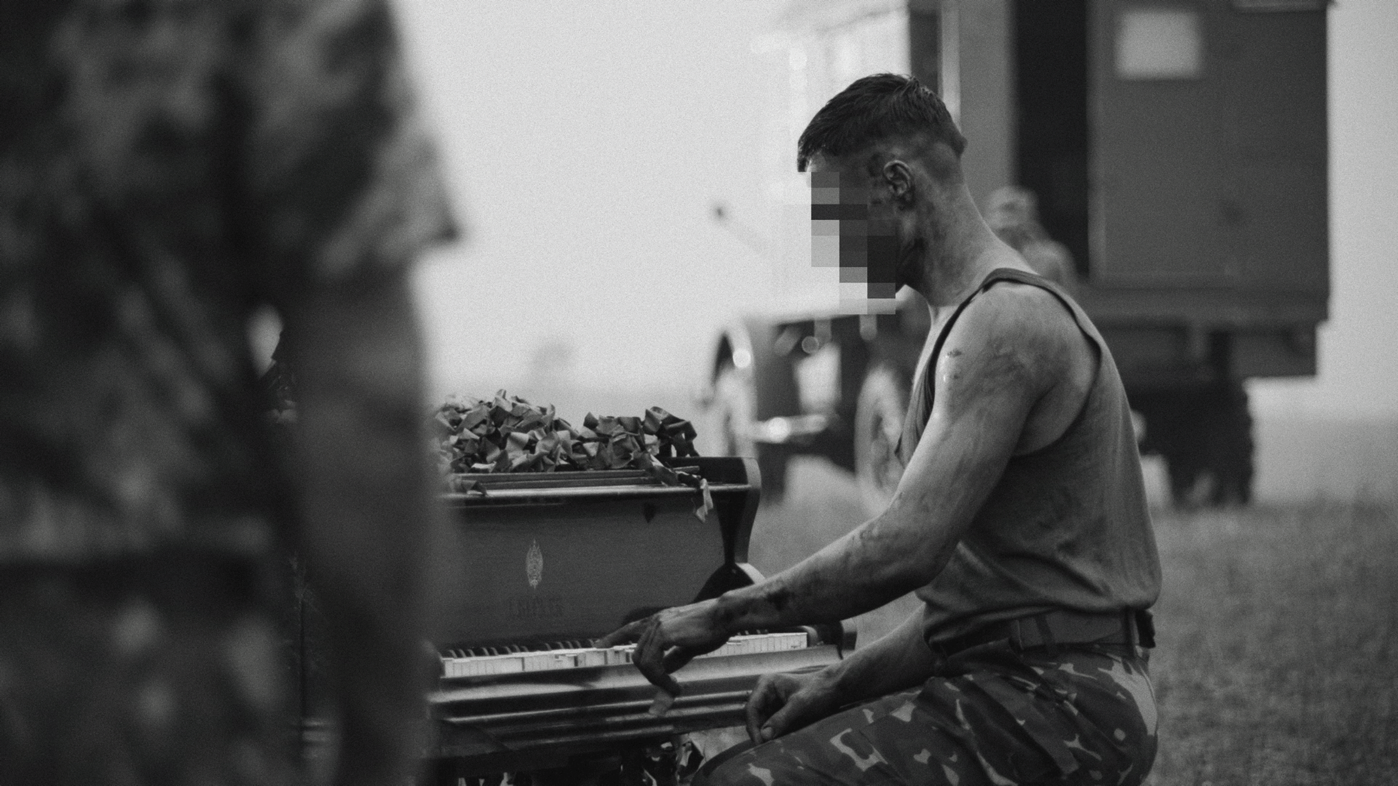 Through soldiers depicted in a desolate countryside with pixelated faces, their propaganda-obscured responsibilities contrasting with their movements, choreographed into gestures of defiance.