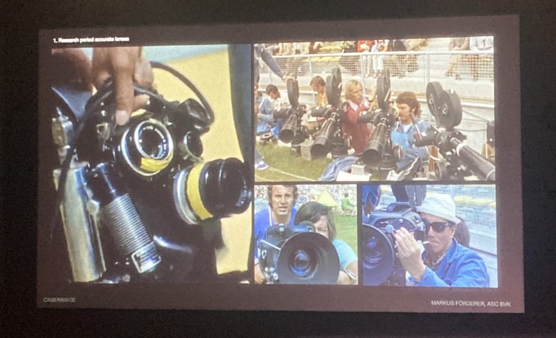 Il a effectué de nombreuses recherches pour déterminer quelles caméras et optiques ont été utilisées à l’époque pour capter les performances sportives. De fait, il y a eu une édition spéciale JO de 1972 de l’American Cinematographer car il s’agissait d’une évolution technologique majeure : la première diffusion télé en live. Cependant elle contenait peu d’informations sur les objectifs utilisés. Toutefois, contrairement à aujourd’hui, les possibilités restaient limitées. D’après les publicités montrant des opérateurs en action dans le magazine, Förderer a vu qu’il s’agissait souvent de téléobjectifs. Mais les décors de son tournage correspondaient à des espaces réduits, donc il lui fallait des focales plus larges. Il a fini par découvrir que la compagnie Voigtländer avait créé les premiers objectifs à focale variable pour les appareils photo 35mm, ainsi que les premiers zooms pour le 16mm et le 35mm, les Zoomar. Le hasard était que cette compagnie était basée à Munich, comme les JO de 72, ce que Förderer a interprété comme un signe.