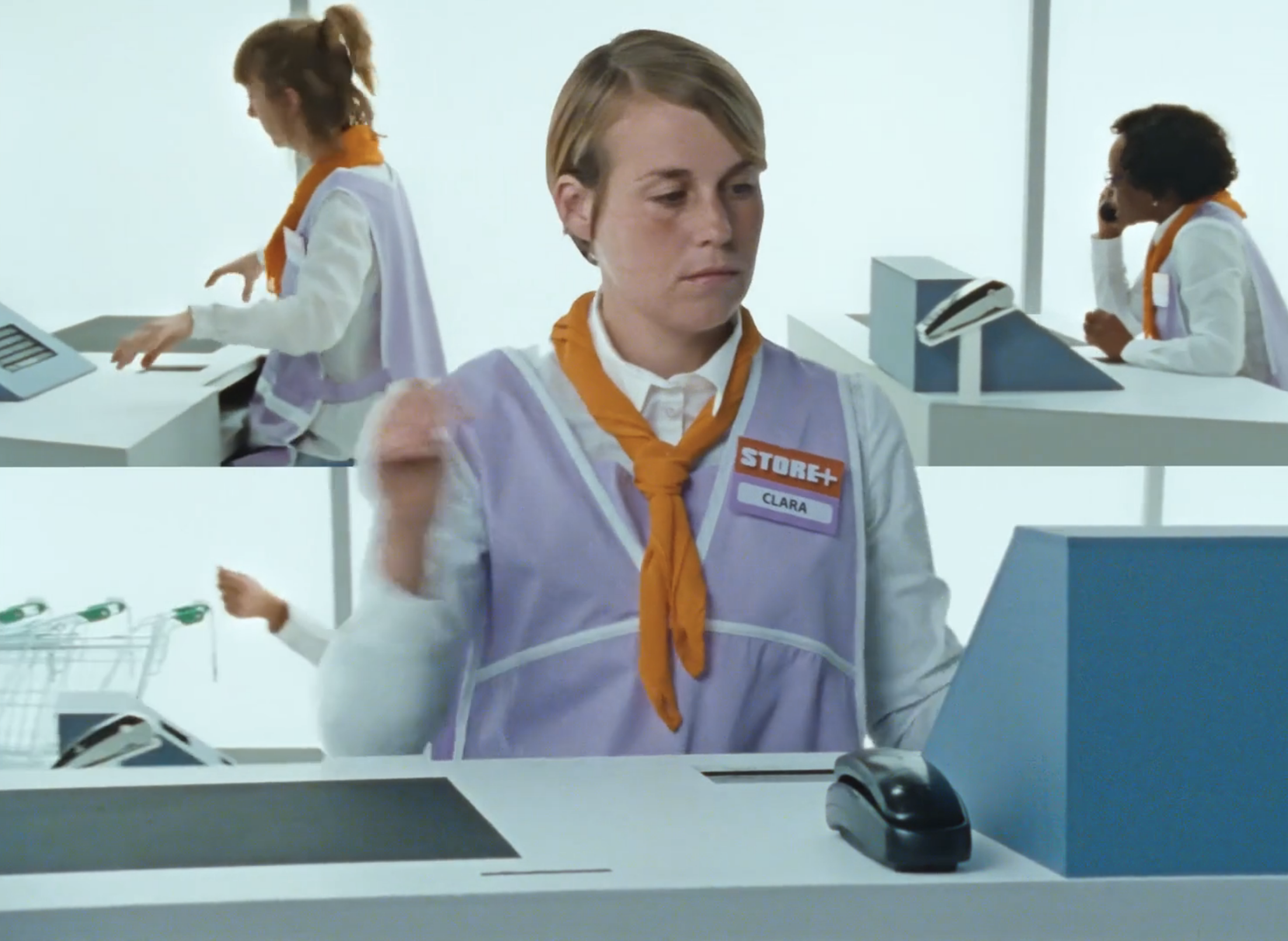 Sarah a conçu l’aspect des caisses avec Eva Medin qui est créditée comme cheffe déco mais qui est avant tout artiste plasticienne. À l’idéal nous racontions un hypermarché avec une vingtaine de caisses, en réalité nous avions les moyens d’en fabriquer cinq. J’ai donc proposé de tricher la position de Léa notre personnage principal selon les axes de façon à ce qu’on ait toujours l’impression qu’il y a d’autres caisses devant et derrière elle. Nous avons aussi précisément placé les caisses pour que la perspective dans le cadre soit la plus intéressante possible. Les choix de Sarah avec Valentine Solé la costumière étaient très réfléchis : le mauve des blouses devait être une couleur « infantilisante », « féminine », le orange de leur foulard une touche de « gaité pour le client ». Sarah et moi avons donc choisi les couleurs du décor du supermarché en harmonie avec les couleurs des costumes. Il fallait que la charte graphique de Store +, le supermarché fictif que nous inventions, soit cohérente.