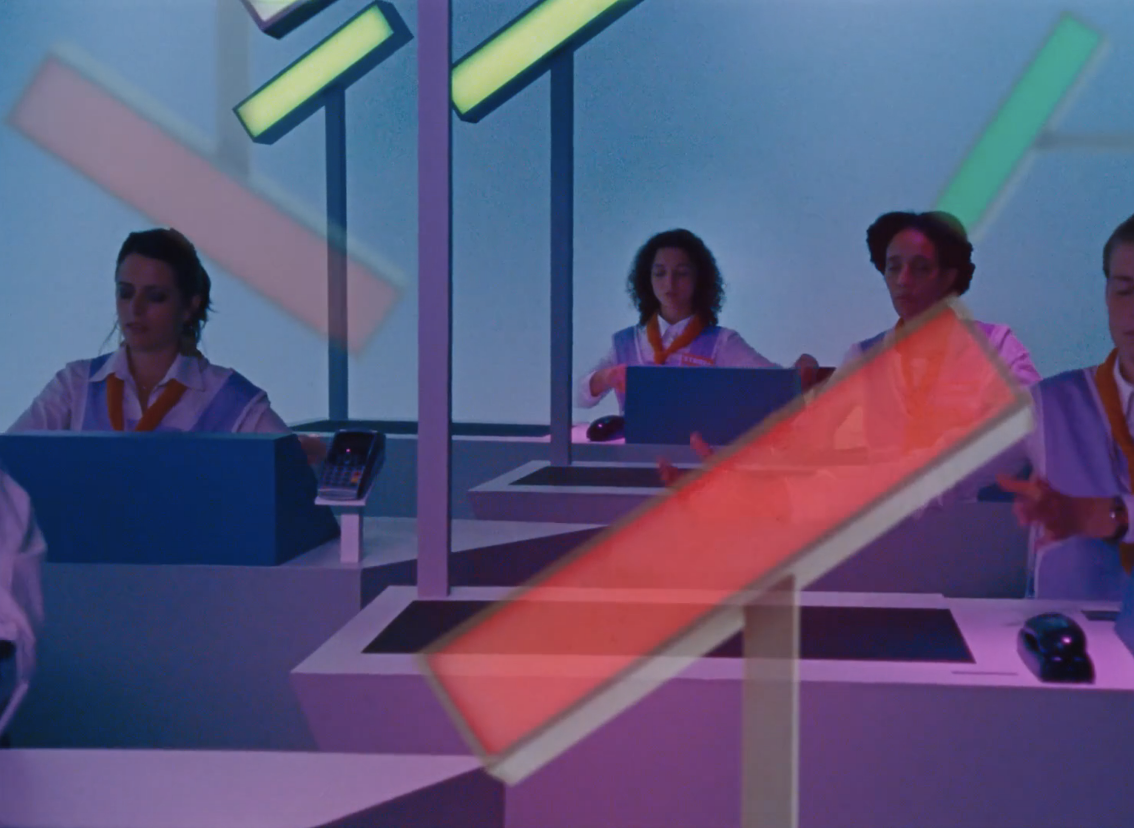 Avec Guillaume Chaumet, mon chef électro nous avions sélectionné le « surprise pink » chez Lee Filters qui est plus violet que rose pour éclairer les caissières. Et nous avons refroidi les 18×4 TheLight (sorte de sunstrips led) qui éclairaient le cyclo au maximum pour avoir ce bleu sur le fond.