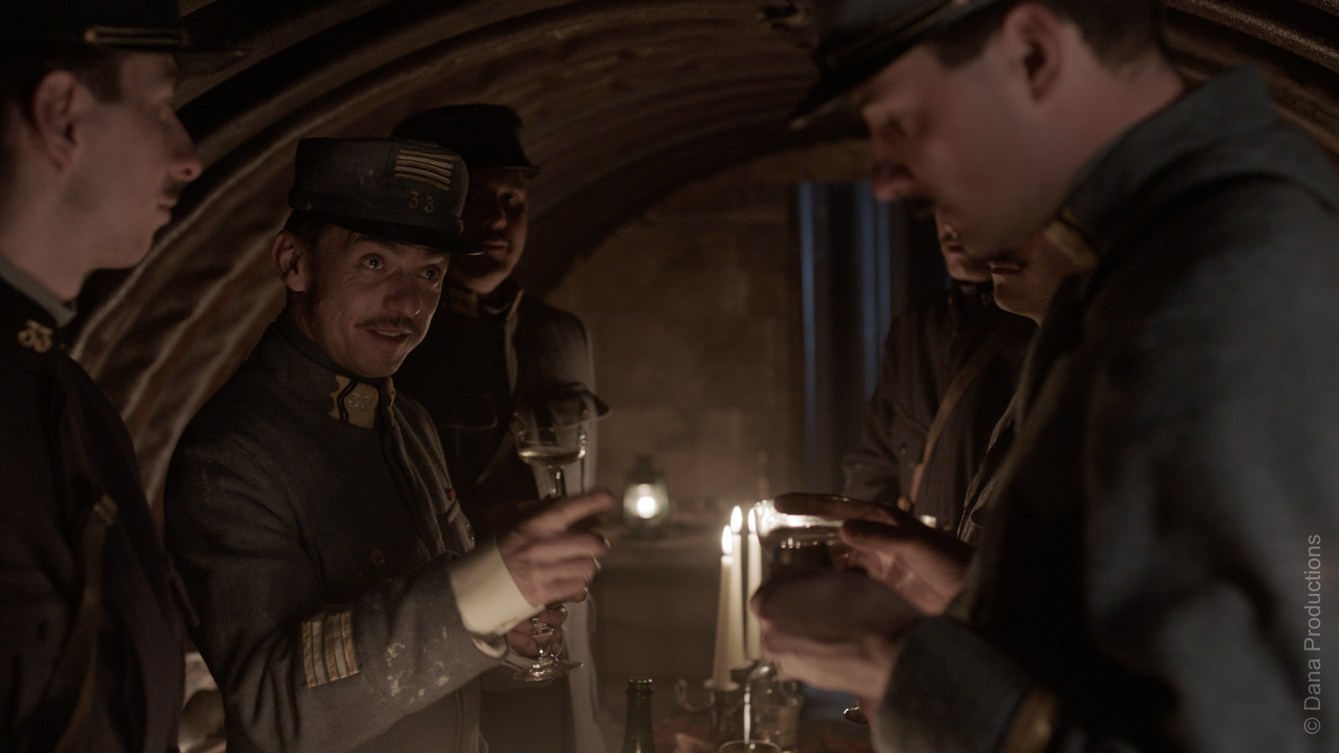 Avec Franklin Ohanessian, le premier assistant réalisateur, nous avons réfléchi à une organisation du tournage permettant de prélighter la veille les décors du lendemain de façon à être les plus rapides possibles au tournage. Cela a été possible car nous sommes restés plusieurs jours sur la plupart de nos décors qui ont été groupés sur trois gros blocs : une maison (dans laquelle nous avons filmé l’appartement familial mais aussi les bureaux des officiers), les tranchées et le fort qui servit de prison à De Gaulle. L’équipe electro-machino, bien que réduite au vu de la nature du projet (1+1 à l’électricité, 1+1 à la machinerie et un stagiaire qui n’a pas ménagé ses forces) a dû s’organiser. Pendant qu’une partie d’entre eux assurait le tournage d’un plan, l’autre préparait les décors à venir. Il fallait également anticiper la répartition du matériel entre le plateau et le prelight, nos listes ayant été pensées en accord avec le budget du film. Ces questions se posaient aussi bien à propos des sources à employer pour éclairer que pour la manière dont nous ferions nos mouvements de caméra, le film comportant beaucoup de travellings. Nous n’avions pourtant pas loué de Dolly et mon chef machiniste, Vincent Trividic a su jongler avec talent avec quelques mètres de rails, un plateau de travelling et un bazooka pneumatique pour rendre possible les mouvements que j’avais proposé à Frédéric. Nous avons aussi utilisé pour un certain nombre de plans une Dana Dolly, qui s’est révélée le bon outil pour filmer les visages de nos acteurs déambulant dans les tranchées.