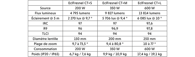 Les EclFresnel CT+ sont disponibles en 3 tailles et puissances (S, M & L) leur permettant de s’adapter à de nombreuses applications et situations. Retrouvez ci-dessous les caractéristiques principales de la gamme :