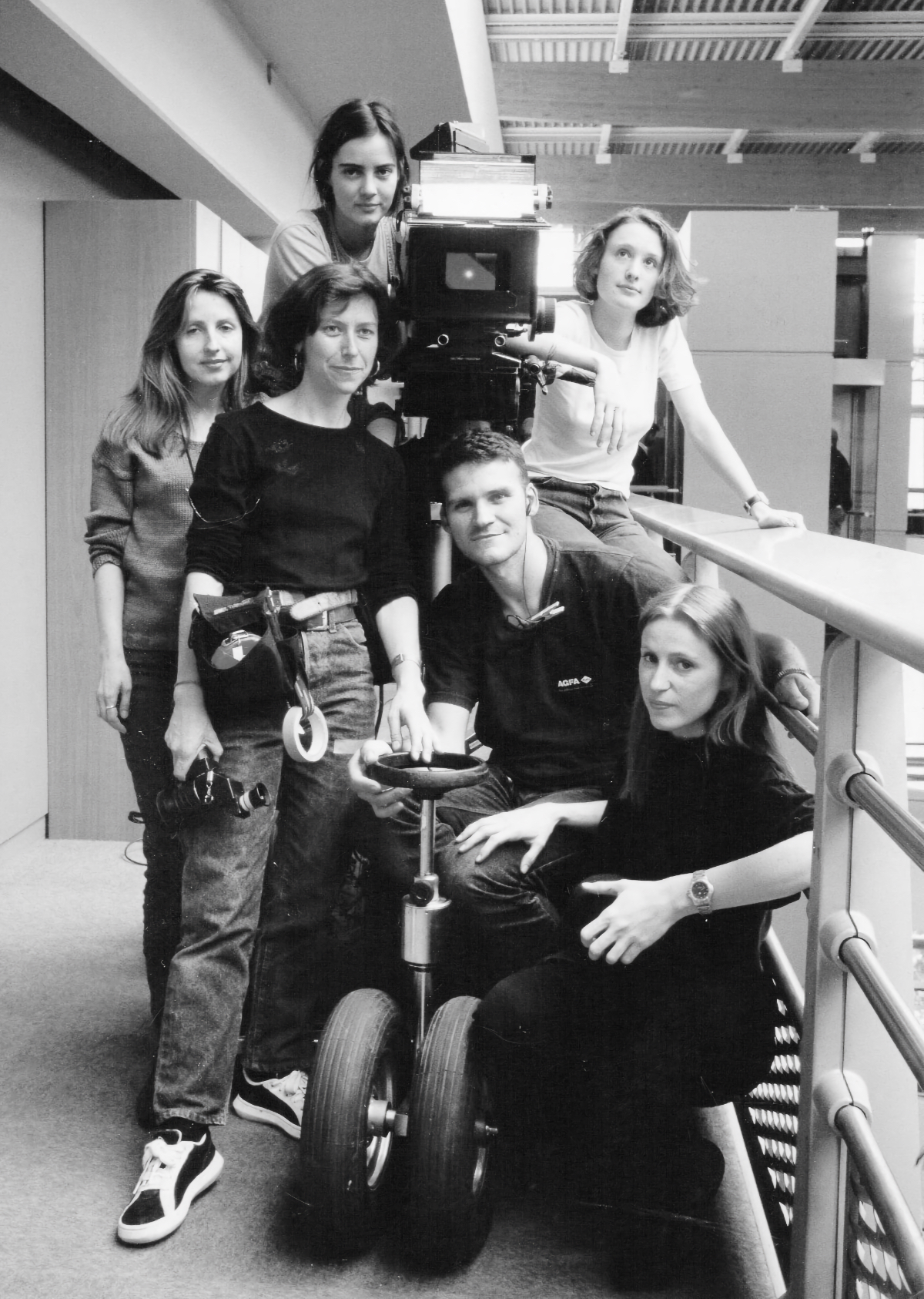 Équipe image sur le tournage de « L’Homme est une femme comme les autres » de Jean-Jacques Zilbermann, 1998 (image : Pierre Aïm). De gauche à droite: Agathe Grau (scripte) en haut Marie Sorribas (2e assistante caméra), je suis en bas (1ere assistante caméra), Alice Ormière (stagiaire scripte), un électro (dont je ne retrouve pas le nom), Béatrice Mermet (3e assistante caméra) – Photo ©Nathalie Eno