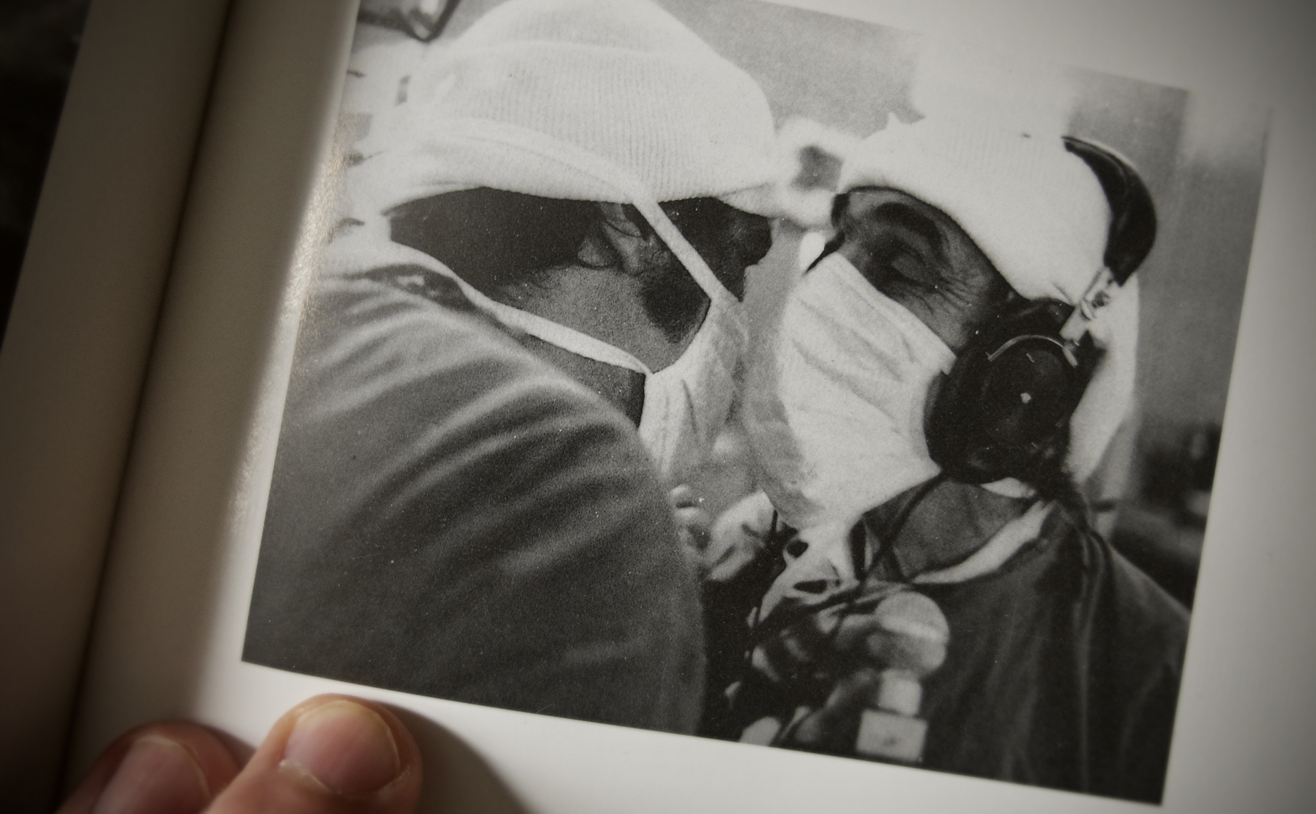 Sur cette photo empruntée au livre Prises de vies – Émulsions d’Éric Pittard, on voit au travail l’opérateur Michel Tommasi et l’ingénieur du son Antoine Bonfanti, auprès de qui j’ai énormément appris. J’aime y voir la complicité à l’œuvre, l’échange malgré les filtres, le cinéma en train de se faire.