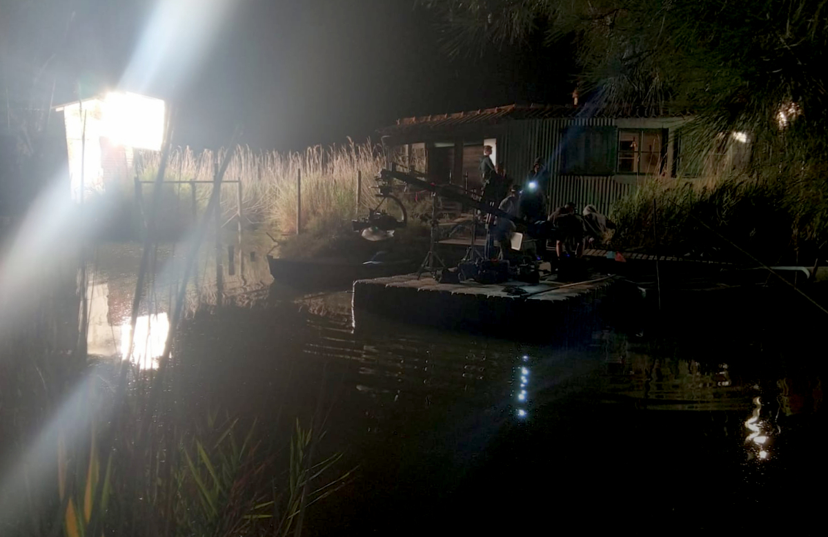 Une installation de nuit avec la grue sur ponton flottant pour “L’Etang d’Or” réalisé par Valérian Denis