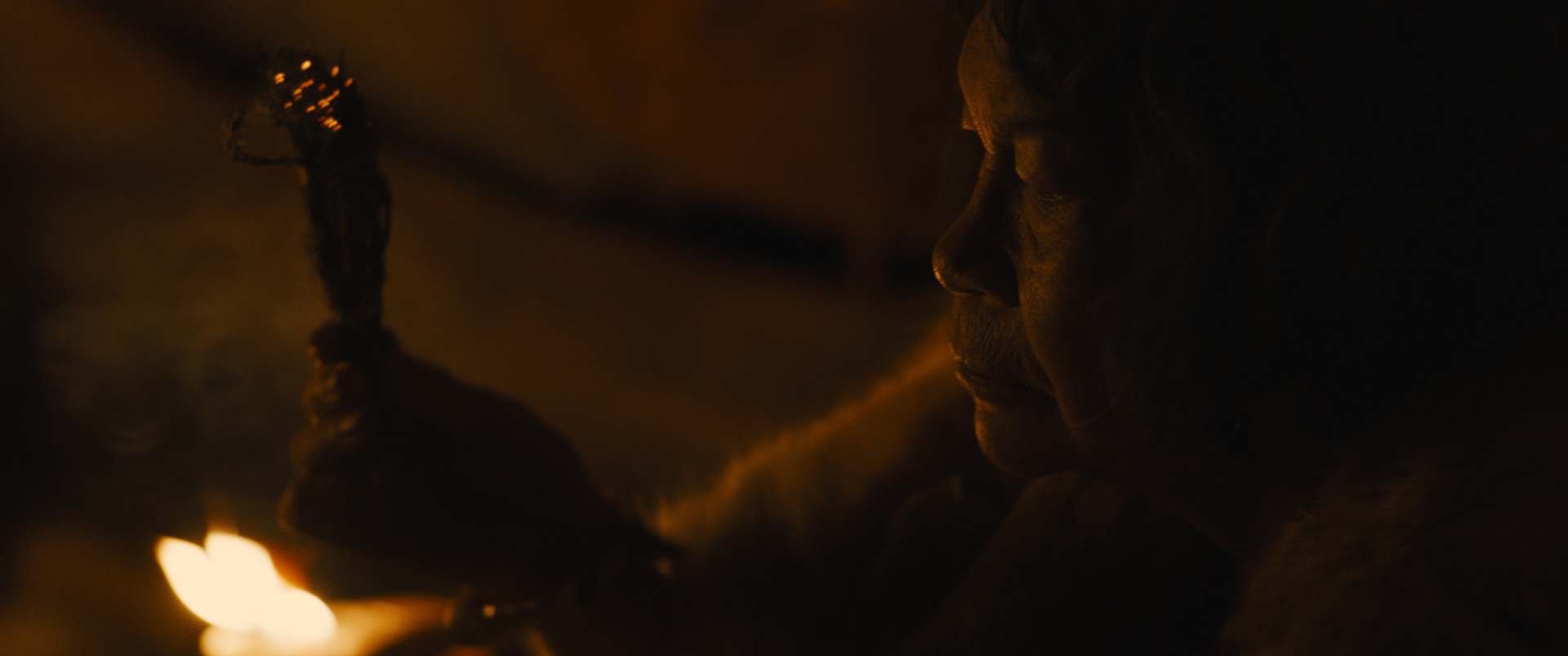 Le travail de la lumière, sur le plateau, était articulé autour de plusieurs principes théorisés en avance avec le réalisateur. Le premier consistait à éclairer entièrement sans électricité. Nous avons donc pris le parti d’éclairer le film entièrement avec des sources « paléo-compatibles ». Lampes de pierre créées par l’équipe déco, torches tenues à la main hors-champs par le chef électricien, Jean Riou (devenu chef pyromane pour l’occasion), et sources bricolées avec bougies double-mèches et papier d’aluminium. Les sources principales étaient souvent visibles dans le champ, et la densité des ombres sur les visages était contrôlée à l’aide d’une source de feu tenue à la main, à côté de la caméra, parfois diffusée pour ralentir le crépitement et adoucir la lumière, parfois non. Le but recherché étant une image dense et contrastée, le choix le plus difficile mais le plus juste était parfois simplement de ne pas céder à la tentation de rajouter de la lumière.