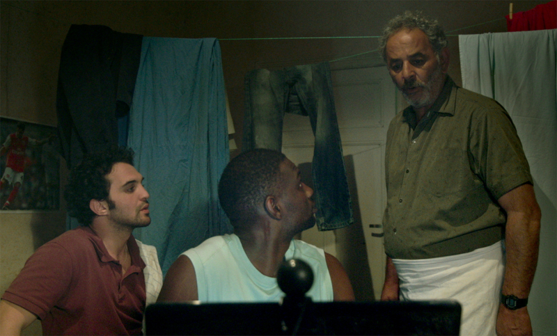 La scène de l’appel Skype entre Abdel et Zaïna, qui représente un tiers du film, a soulevé bien des questionnements : est-ce qu’on allait jouer ça en direct, avec quel système, avec une vraie connexion internet ou en réseau interne, avec quelle interface pour le logiciel (on est censés être en 2006) ? Quel était le meilleur système pour laisser le plus de liberté possible aux comédiens, sans entraves techniques, tout en évitant les bugs de réseau ? Après avoir analysé les différentes options, nous avons opté pour la plus simple : un appel en temps réel sur une vraie plateforme skype (dont le chef déco, Pierre Moreau, avait réussi à installer une ancienne version) en réseau wi-fi fermé. S’agissant d’un huis clos, le travail sur le décor était fondamental ; par ailleurs la mise en scène de Laure se sert énormément du décor pour signifier les relations entre les personnages et déterminer leurs interactions. Nous avions d’abord imaginé recréer un décor en studio, mais les contraintes de production nous ont obligés à y renoncer. Avec Laure, avant même de trouver un chef décorateur, nous avons fait des repérages en Seine Saint-Denis, visitant des hôtels fréquentés par des travailleurs étrangers, très ressemblants à l’hôtel du 20e arrondissement de Paris dans lequel travaillait le vrai Abdel, aujourd’hui désormais transformé en café chic. La région Aquitaine ayant financé le film, le tournage devait impérativement se dérouler dans le département des Landes. Il fallait donc trouver un décor de bar/hôtel décrépi de la région parisienne…dans un département touristique du sud-ouest !