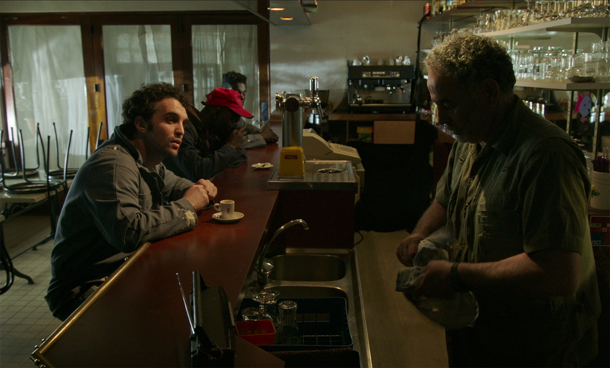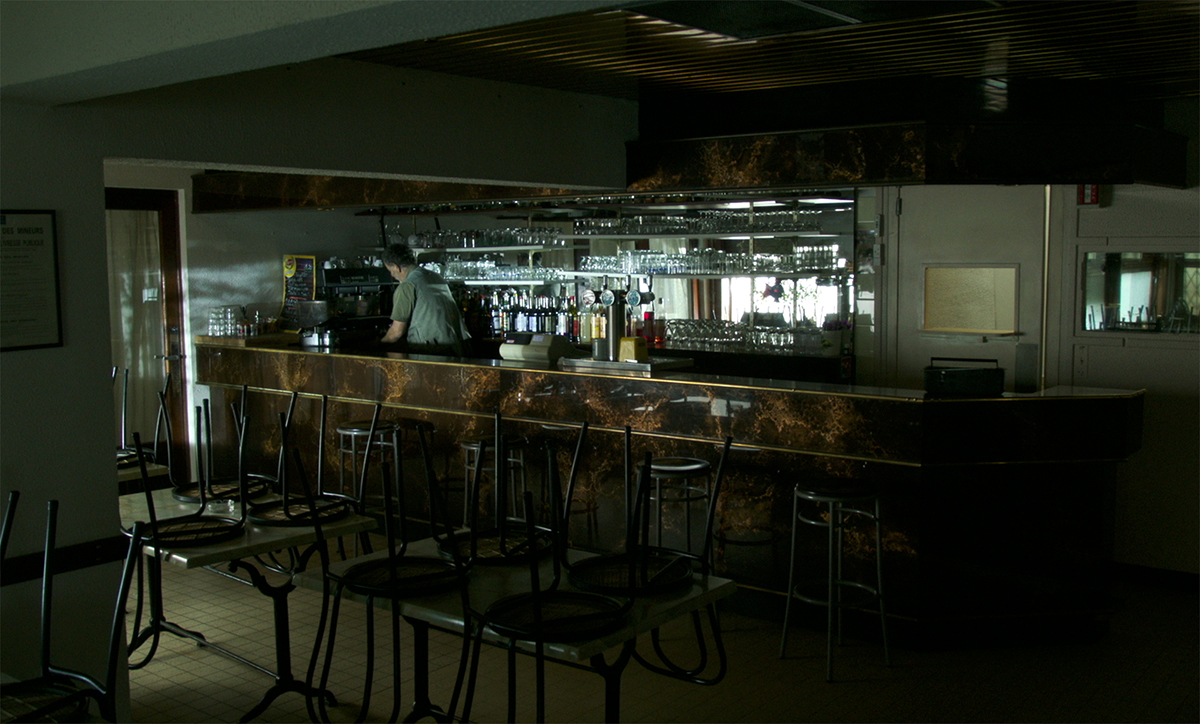 D’une manière plus globale, nous avons tracé une sorte de cheminement de la lumière tout au long du film, où le décor du bar revient à plusieurs reprises, dans des ambiances lumineuses et chromatiques très différentes : pour le début du film, dès l’écriture du scénario, Laure envisageait une ambiance de pénombre, où l’on aurait découvert le visage d’Abdel au fur et à mesure de la première séquence. Une photo du belge Harry Gruyaert nous a donné la direction pour ce début de film : à l’intérieur d’un bar on aperçoit la silhouette d’un homme dont on distingue uniquement les parties du corps qui sont éclairées par une lumière solaire qui filtre à travers les ouvertures. La pose est faite sur les parties de l’image en lumière, le résultat est très contrasté et surprenant : une scène banale se remplit de mystère grâce au choix d’exposition fait par Gruyaert.