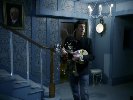 – Michel m’a appelé, il m’a dit : « On va faire un clip à Londres avec Paul McCartney j’ai besoin de toi, tu viens me faire l’image, il y a un très gros décor de plusieurs centaines de m2, il va falloir que tu ailles faire des repérages ». Donc la production, Partizan, m’a pris un billet de train et je suis allé sur place. J’arrive sur le studio où tout était en construction avec Stéphane Rozenbaum, le chef déco, pour moi c’est un peu la surprise. Avant de partir, Michel m’avait simplement indiqué qu’il allait y avoir beaucoup de mouvements de caméra et qu’il ne voulait surtout pas être contraint par des sources au sol. Alors j’ai décidé de travailler avec des sources sur grill pour que la lumière parte du haut vers le bas, de manière à ce qu’il y ait un minimum de projecteurs sur le plateau. Ce qu’il ne m’avait pas dit, c’est que le décor était construit en double, d’un côté il y avait le décor normal avec les meubles, tapisseries et avec tout ce que l’on veut, mais de l’autre côté symétriquement, il y avait la même chose avec des cubes noirs et un fond noir.