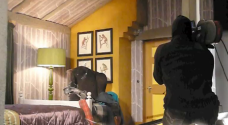 Mais Michel, ce farceur, ne m’avait pas dit comment tout cela allait fonctionner sauf à un moment donné où il m’appelle et me dit : « – Alors comment ça se passe ? – Écoute, pas si mal que ça, j’ai trouvé comment éclairer etc ». Et là il me dit sans m’expliquer : « Alors tu vas me faire des essais sur des réflexions ». Je lui dis : » Mais des réflexions de quoi ? – Ne pose pas de questions, fais-moi confiance, tu me fais des réflexions sur le décor et tu filmes ces réflexions ». Alors le chef déco, qui était dans la confidence, m’a bricolé une petite pièce avec sur une partie un décor, un fauteuil, des accessoires et sur une autre partie un fond noir et entre les deux, une vitre. J’ai commencé à travailler là-dessus et j’ai enfin pu comprendre ce qu’il voulait faire. J’ai fait le prototype, ça a marché, je suis revenu à Paris, on a envoyé tout ça à la production et peu de temps après Michel m’a dit : « C’est bon, on peut rouler! ».
