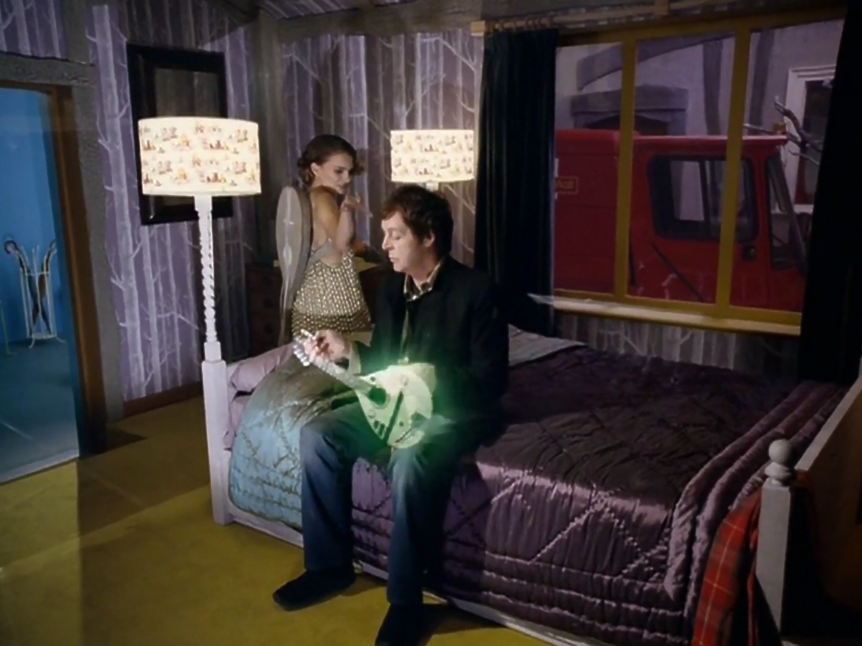 – Il y a eu en effet un travail de costumes énorme, je ne sais pas si tu as vu les personnages, ils n’étaient pas habillés comme tout le monde, avec des cuillères accrochées aux costumes, c’était un travail esthétique très poussé sans être trop technique. En plus du blanc, certains personnages étaient par exemple recouverts de surfaces métalliques en papier d’aluminium et autres matières très réfléchissantes. Pour ce qui est du maquillage, Natalie était maquillée sans traitement particulier, ce n’est que le travail de la lumière qui accentuait sa présence. Petite particularité et anecdote, sa robe était en perles de bois parce que Paul McCartney avait demandé qu’il n’y ait rien qui provienne d’animaux sur le plateau. Nous étions tous obligés de laisser nos ceintures et ceux qui avaient des chaussures en cuir sont allés s’acheter une paire de tennis. C’était son caprice, mais le seul, car Paul McCartney était extraordinaire de gentillesse, un mec adorable.