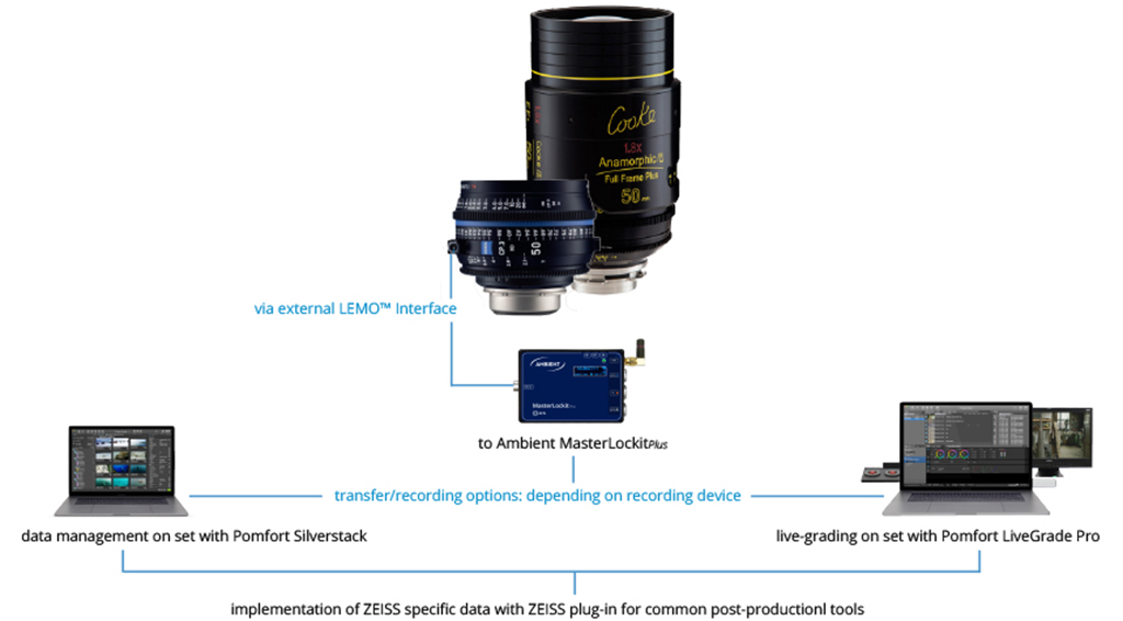 Ambient propose de son côté une intégration dans la chaîne image avec le MasterLockit Plus et un système réseau propriétaire, ACN, qui permet par exemple de récupérer les métadonnées générées par les optiques Zeiss (Supreme primes et CP.3 XD) et Cooke (les optiques S4/i) les plus récentes. Il est ainsi possible d’exploiter les données liées à l’optique via Silverstack et LiveGrade Pro (Pomfort) par exemple, si toutefois le modèle de caméra utilisé est à même d’enregistrer ces données (VFX friendly non?). Ambient a aussi créé une app, LockitScript pour les besoins du rapport image.