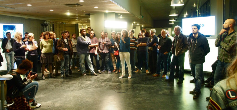 Je retrouve alors les quelques têtes qui me sont familières, autant des membres de l’association que des amis ou connaissances, travaillant dans les métiers de l’image. Nous sommes tous là, réunis en ce soir particulier, pour l’inauguration du site internet de l’Union. Je n’étais pas encore dans l’association lorsque celle-ci a été créée mais j’assiste comme à son deuxième lancement – ayant raté le premier. L’atmosphère est différente des soirées discussion auxquelles j’ai pu assister ces derniers mois. Déjà nous sommes très nombreux. Ensuite, j’ai le sentiment que nous sommes réunis ce soir, pour fêter tout ce qui a déjà été accompli et encourager les futures avancées et projets en devenir.