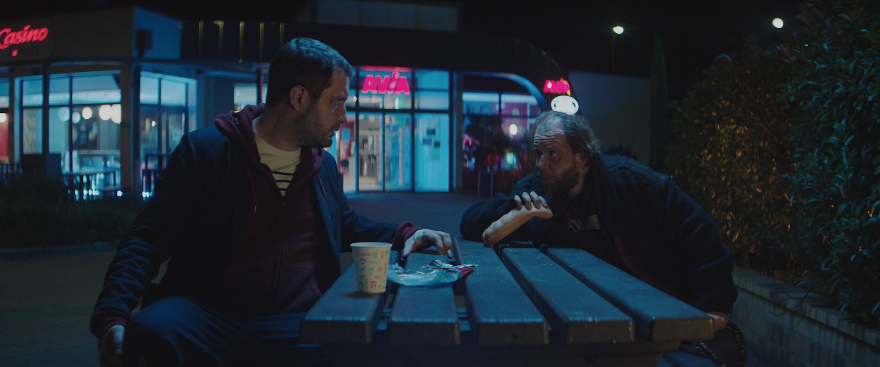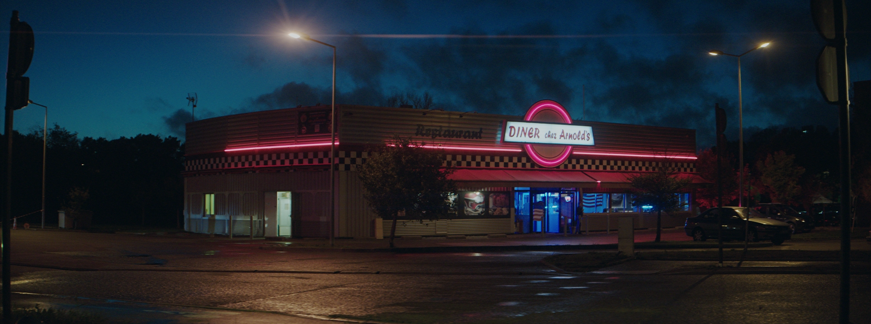 Alors le scope anamorphique a aidé. Et puis la recherche des décors, en privilégiant les grands espaces. On peut avoir des décors avec beaucoup de profondeur, ici comme ailleurs. On a cherché aussi des décors un peu uniques, comme le snack avec tous ses néons. Il ne faut pas trop vouloir faire du cinéma américain car on n’en a pas les moyens. Mais on peut quand même investir les décors comme les Américains le font : en mettant de la fumée, en mettant de la pluie ou en mouillant les sols. Quand on demandait ça il y a dix ans, on nous hurlait dessus, mais ça devient de plus en plus commun. Tout le monde comprend que c’est un vrai atout en photographie. Tu gagnes en profondeur et tu as moins besoin d’éclairer. C’est compris. Les films américains le faisaient depuis les années 50. Peut-être qu’en France, c’est la Nouvelle Vague qui s’est un peu opposé à cela, car ces effets étaient présents dans les vieux films français.