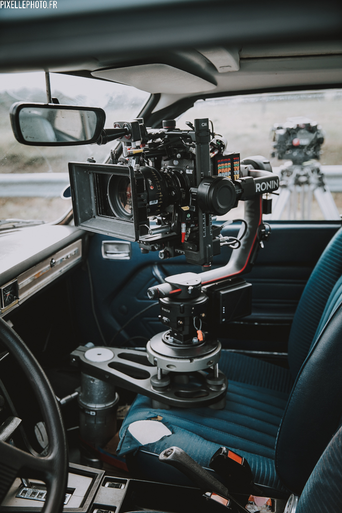 Oui, j’ai un Ronin, que je cadre parfois avec des manivelles. J’ai acheté le Ronin, et les manivelles (il y a le système Microforce aussi, qui permet de cadrer avec une tête fluide, mais je préfère les manivelles). J’ai toujours rêvé d’avoir une tête deux axes, mais c’est beaucoup trop cher. Le Ronin me permet des petits luxes, sans trop coûter à la production. Si je le monte sur un Long John, je peux monter jusqu’à 7 mètres et cadrer depuis le sol. C’est moins cher qu’une nacelle ou une grue. Le Ronin a ses limites, mais pour les mouvements droits c’est parfait avec les manivelles, et puis si on ne peut pas avoir de steadicamer, ça peut sauver des idées de plans de temps en temps. On m’a dit aussi d’acheter un Black Arm pour les accroches véhicule… mais je ne l’ai pas fait. Cela dit sur le film tout ce qui est rouling est en Black Arm + Ronin, et pour le plan de fin (où l’on est quand même au 100 mm + doubleur, donc 200 mm), avec un Black Arm et un Ronin, sur un bateau, on est vraiment stable. En réalité, je ne le porte pas souvent, mais je l’utilise beaucoup comme une tête remote : par exemple, je le monte sur la Dolly et je le télécommande aux manivelles. Ou bien je le fais porter par des machinistes. Et… puis aussi je l’utilise par sécurité, si la caméra est en bord de route avec des voitures qui passent à fond la caisse : elle est sur le Ronin ! Et moi je la cadre d’un peu plus loin.